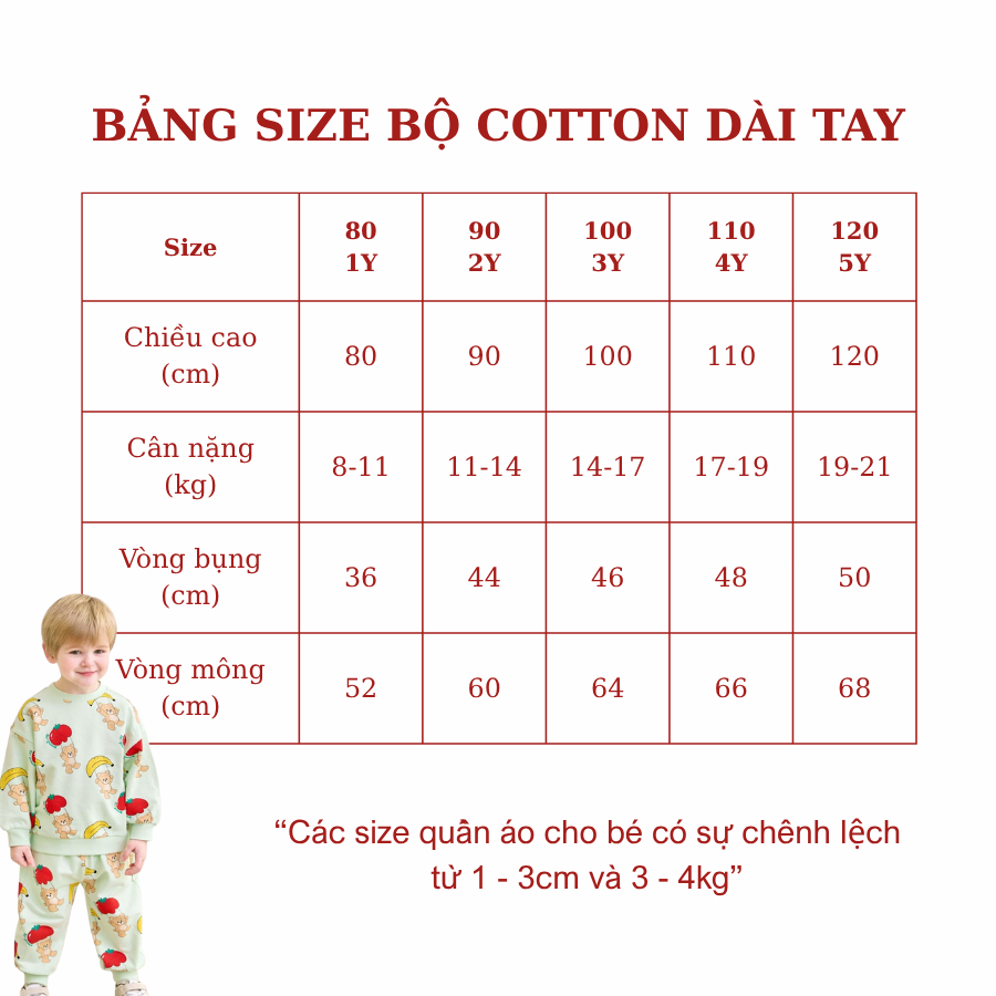 Bộ cotton co giãn 4 chiều, 100% vải cotton Hàn cao cấp. Mềm mịn, thoáng mát, không lo bí da, thoát mồ hôi cho bé. Bé thoải mái vận động cả ngày.
